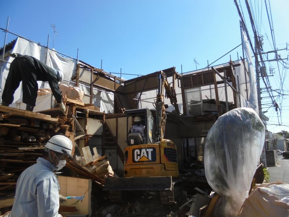 1階が店舗の木造2階建ての解体工事でした。以前は長屋だった場所のため、足場を建てれないほど両隣との建物の間が狭かったため、道路に面した箇所だけ足場を建てるような現場でした。とうぜん重機を入れるようなスペースもないためほぼ手壊しで解体していきました。また、電話線やケーブルテレビなどの線が建物の間に入り込んでいたため、各管理会社に問合せしてもなかなか撤去の段取りができず時間を要しました。 最後の試掘時に昔建っていた家屋の松杭があらわれましたが、鎖を巻きつけユンボで引き抜くことができ埋設物も無事撤去できました。 いろいろと手間のかかる現場でしたが、安全作業で工事を終えることができてよかったです。