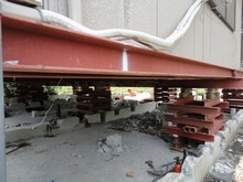 木造住宅の基礎改修のため、既存の基礎(約100m2)を解体する工事でした。上屋のジャッキアップは別の業者が行っており、通常は曳き家をするところですが、スペースが周りにないため、ジャッキアップした建物の下での作業でした。ハンドブレーカーや大割を付けたミニユンボで砕き、細かくして解体・撤去しました。予想外の地中障害物なども出てきましたが当初予定の1週間で完工できました。